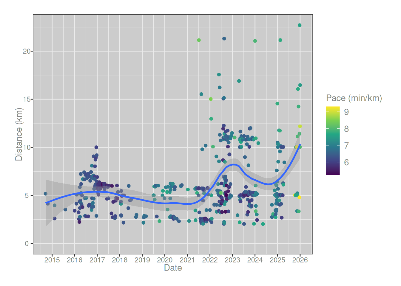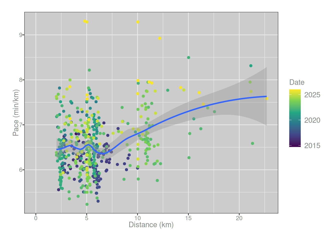 runs_summary |> ggplot2::ggplot(ggplot2::aes(date, distance/1000)) + ggplot2::geom_point(ggplot2::aes(color = pace)) + ggplot2::geom_smooth(method ="loess", formula = y ~ x, span = .5) + ggplot2::labs(x ="Date", y ="Distance (km)", color ="Pace (min/km)") + ggplot2::scale_color_viridis_c() + ggplot2::scale_x_datetime(date_breaks ="1 year", date_labels ="%Y") + ggplot2::expand_limits(y =0)