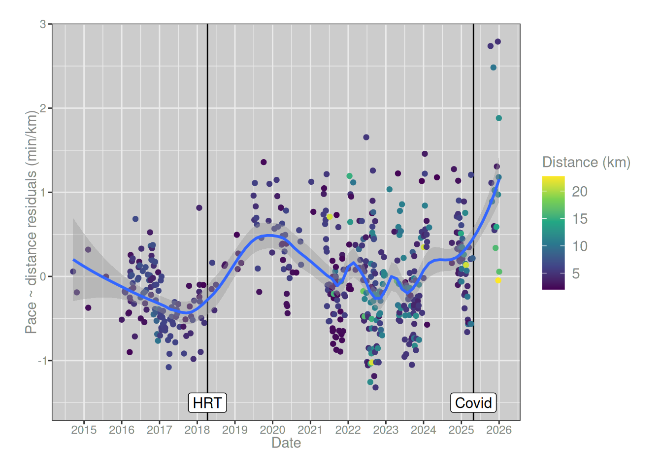 To investigate the question, the natural place to start is to draw a scatterplot showing my pace for each run as a function of the date of the run. As you can see from the loess regression line plotted in blue, there’s a very sharp spike on the right hand side, matching exactly the time at which I started running post-covid. My pace is substantially slower now than it was a year ago, and the size of the spike is much larger than any other change that I’ve experienced in the last 12 years. The only slowdown that even comes close was the one that occurred around 2018, and that one also has an explanation in terms of an exogenous factor: that was when I started taking estrogen.7