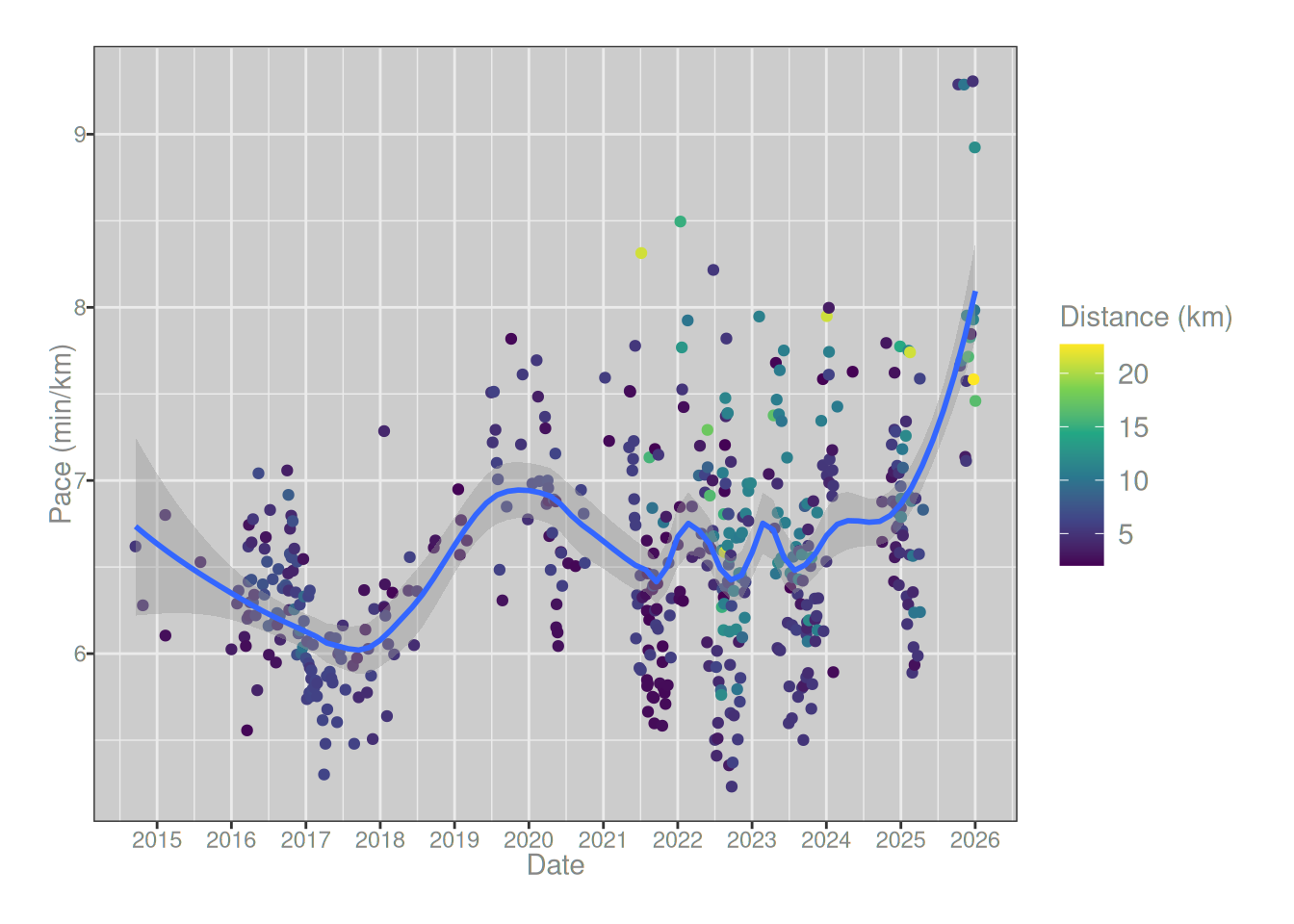 runs_summary |> ggplot2::ggplot(ggplot2::aes(date, pace)) + ggplot2::geom_point(ggplot2::aes(color = distance/1000)) + ggplot2::geom_smooth(method ="loess", formula = y ~ x, span = .3) + ggplot2::labs(x ="Date", y ="Pace (min/km)", color ="Distance (km)") + ggplot2::scale_color_viridis_c() + ggplot2::scale_x_datetime(date_breaks ="1 year", date_labels ="%Y")